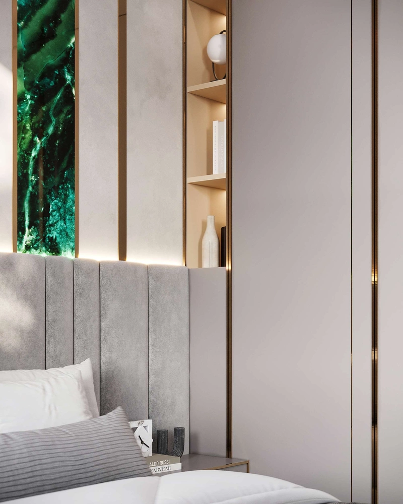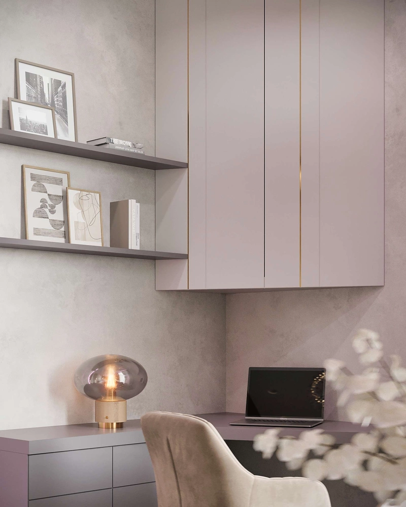 Детская — это стильное и функциональное пространство, оформленное в спокойных серых тонах с золотыми акцентами. Изголовье кровати дополнено вертикальными вставками с текстурой камня и мягкой подсветкой. Рабочая зона выполнена в лаконичном дизайне с мягким креслом и встроенными шкафами. Бархатный пуф насыщенного зеленого оттенка добавляет интерьеру глубины. Люстра с хрустальными элементами делает пространство изящным и уютным.