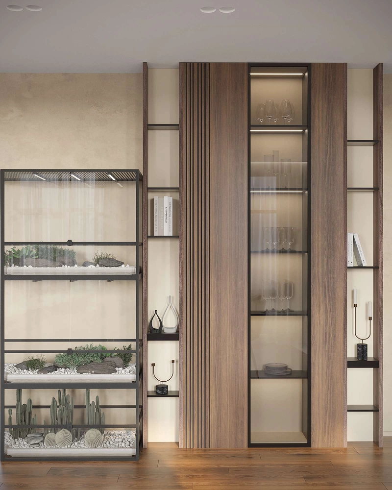 За счет открытой планировки пространство выглядит легким и воздушным. Террариум расположен в удобной зоне, что обеспечивает комфортный уход за питомцем.