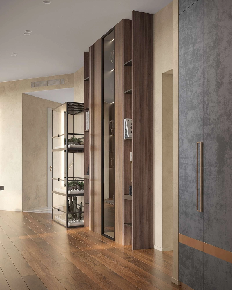 Светлая и просторная прихожая благодаря демонтажу перегородок теперь наполняется естественным светом. Встроенный шкаф с вентиляцией обеспечивает быструю сушку одежды, что особенно удобно в межсезонье.