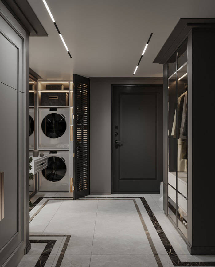 - Разместить в достаточно небольшой квартире прихожую с местами хранения и отдельной постирочной
