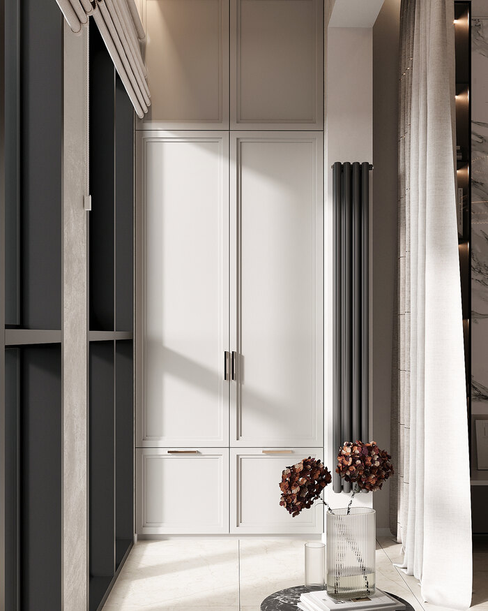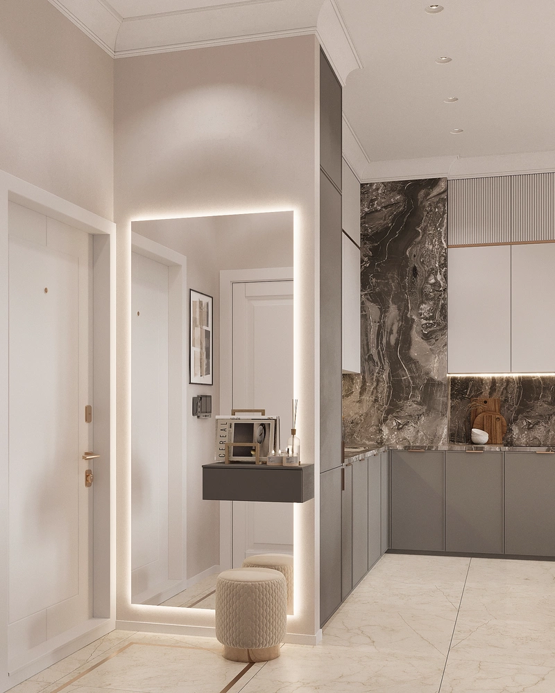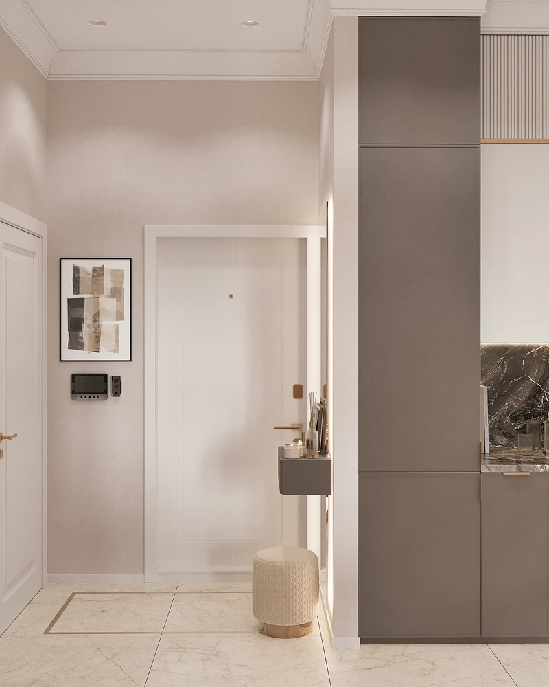 Отделка выдержана в общей стилистике квартиры: сдержанные оттенки и декоративные элементы в неоклассическом духе. Прихожая стала аккуратным и практичным пространством, которое встречает хозяйку светом и ощущением порядка.