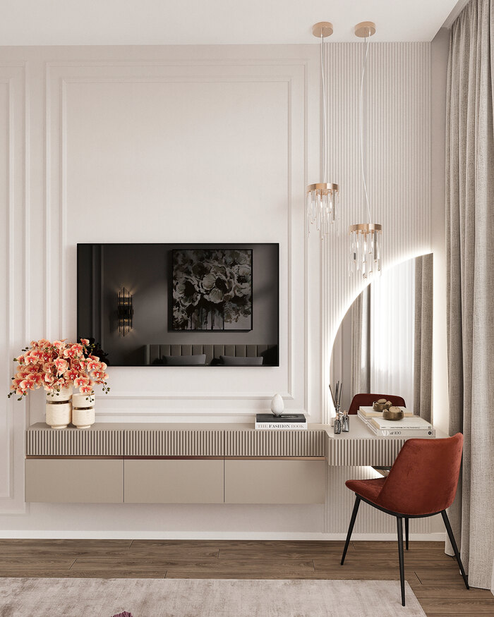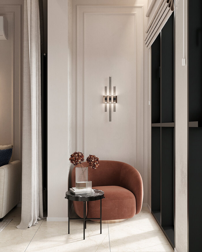 Каждое решение продумано так, чтобы квартира выглядела просторнее и светлее, при этом сохранила эстетику и практичность. Интерьер получился женственным, лёгким и функциональным: здесь есть место для отдыха, хранения и ежедневных ритуалов.