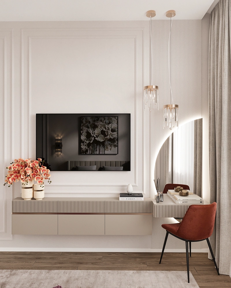 Для хранения предусмотрен вместительный встроенный шкаф, который не утяжеляет интерьер за счет фасадов в цвет стен. Дополнительно в комнате размещена консоль с зеркалом и подвесным освещением — практичное решение, которое заменяет туалетный столик и делает зону удобной для ухода.