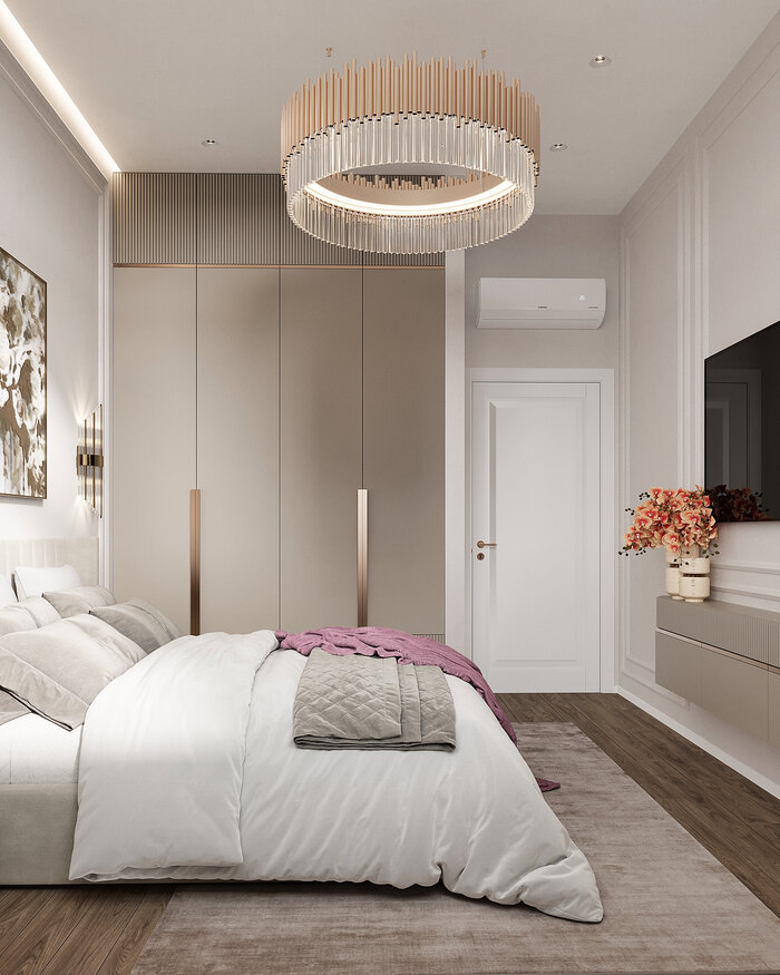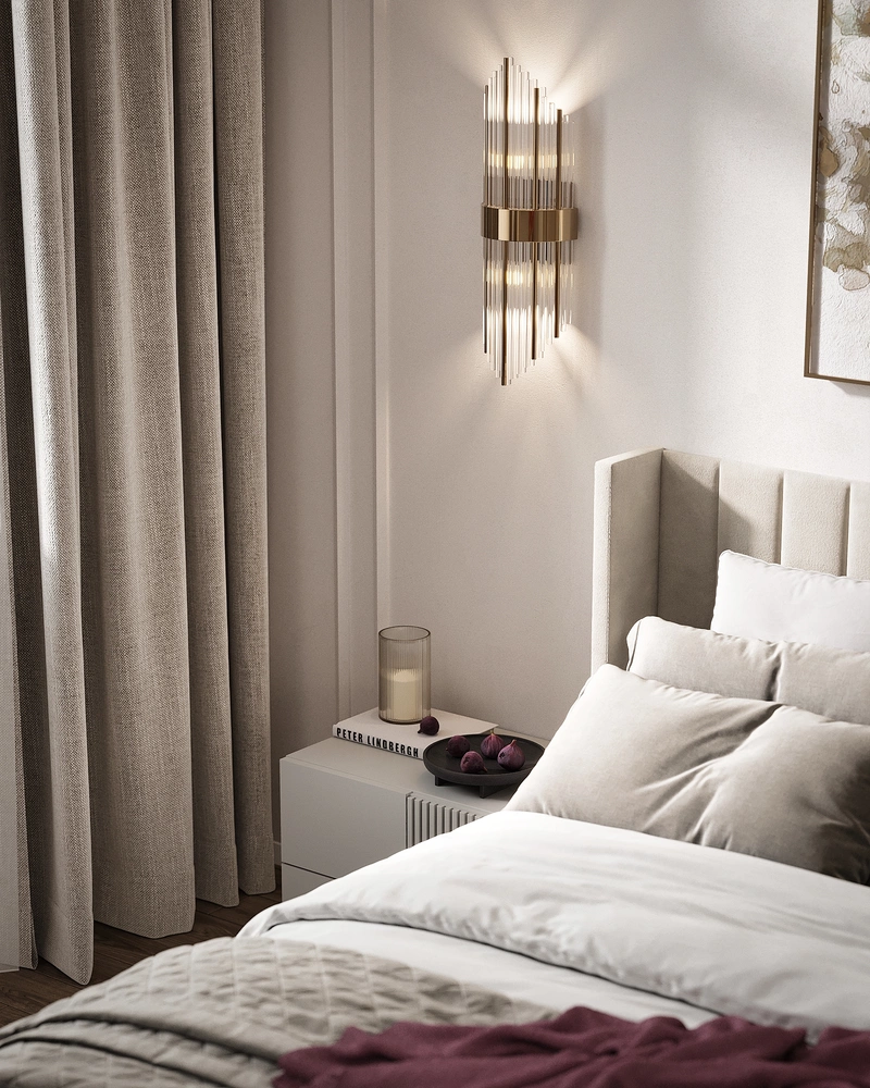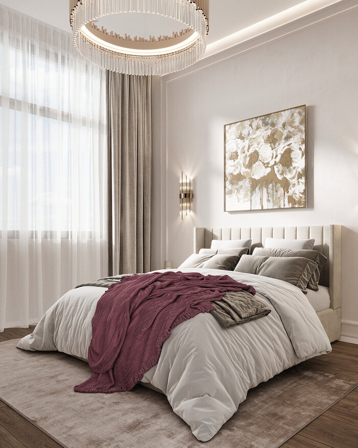 С обеих сторон кровати расположены симметричные тумбы с настенными светильниками, которые создают мягкий рассеянный свет для вечернего отдыха. Центральная люстра добавляет торжественности и завершённости образу комнаты.