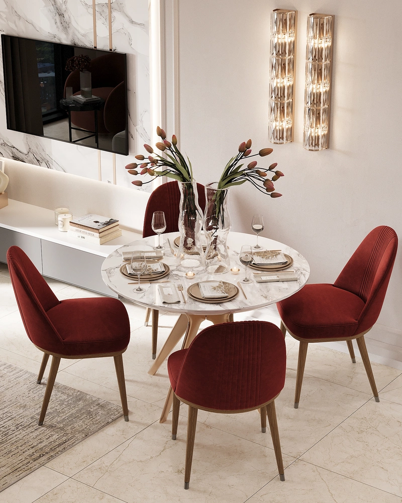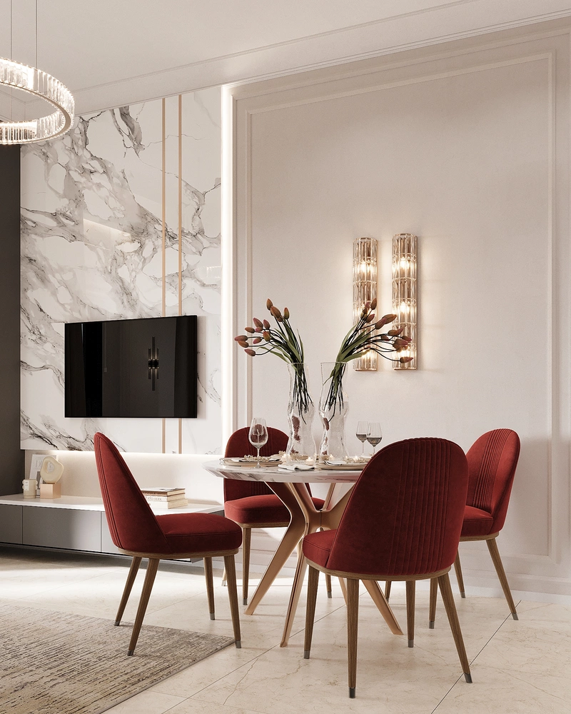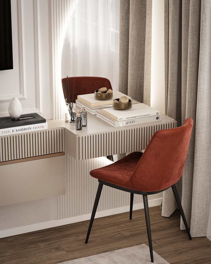Чтобы интерьер не выглядел излишне строгим, мы добавили цветовые акценты: глубокий винный и приглушённый розовый в мебели и текстиле. Эти детали оживляют пространство и делают его индивидуальным.
