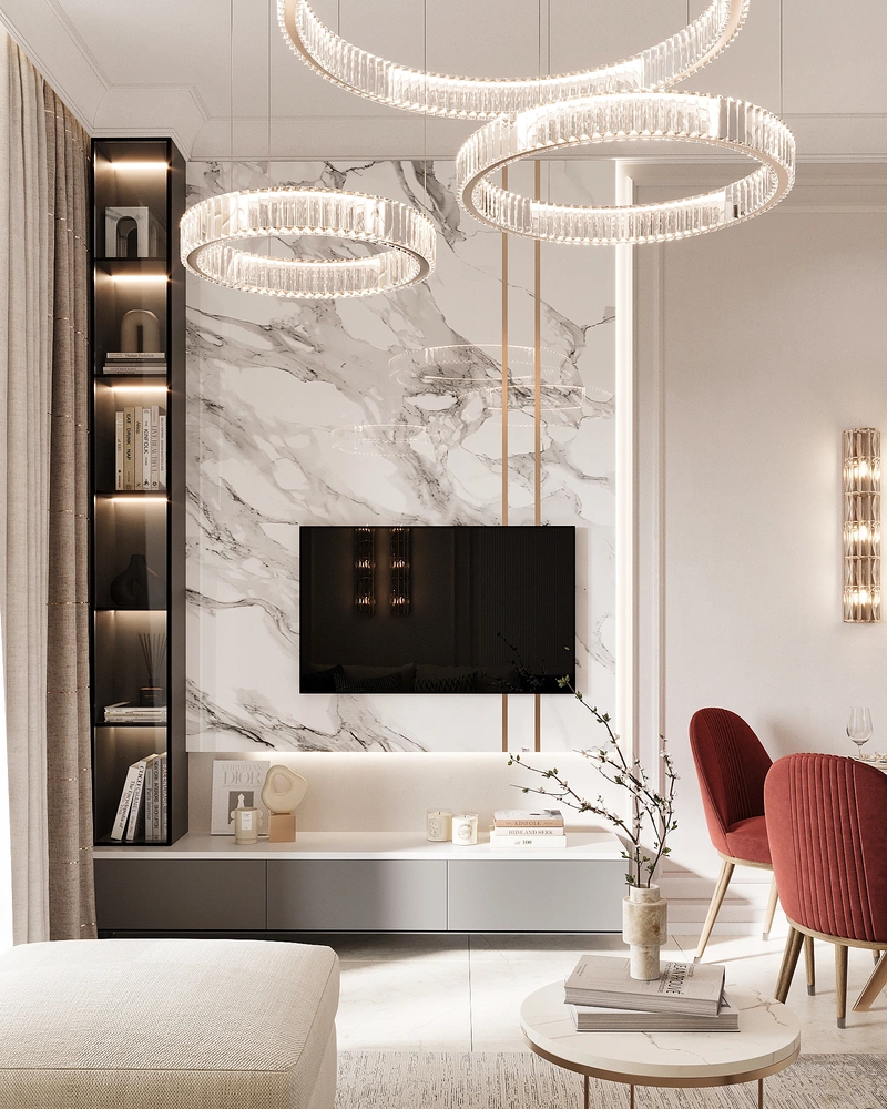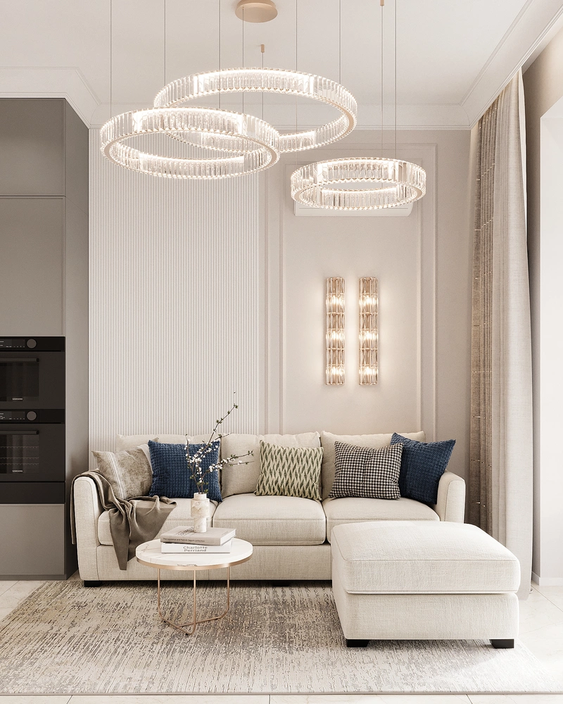 Освещение играет важную роль: подвесные светильники в форме колец создают атмосферу современного салона, а локальные бра и скрытая подсветка делают комнату многослойной и уютной в вечернее время.