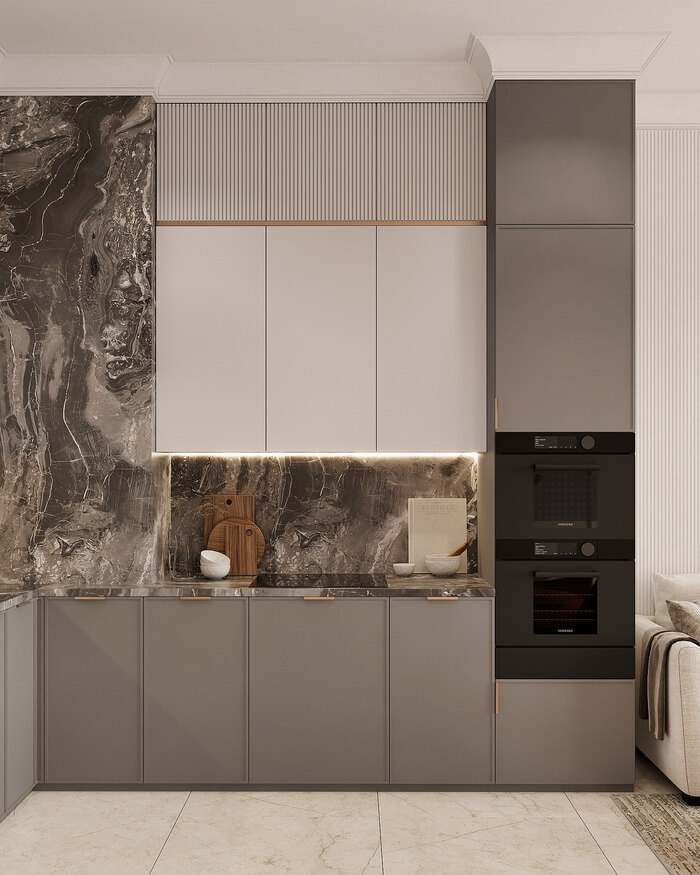 Главным пожеланием хозяйки было сохранить простор и добавить света. Кухня выполнена в лаконичной геометрии и спокойной цветовой гамме. Нижние фасады в серо-бежевых оттенках гармонично сочетаются с верхними светлыми шкафами, а акцентная стеновая панель с выразительной мраморной фактурой задаёт интерьеру статусность.