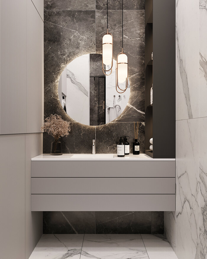 Зеркало с подсветкой и встроенные шкафчики обеспечивают удобство повседневного использования, а правильно подобранное освещение делает помещение светлым даже без естественного света.