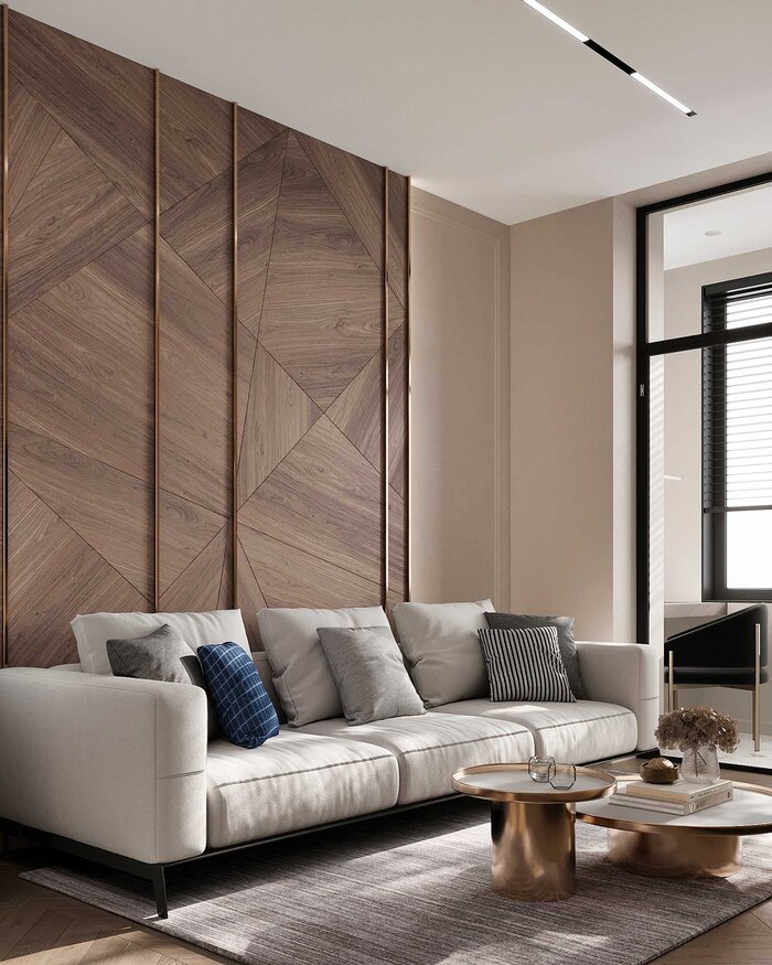 - Шпонированные панели в отделке – используются в разных зонах квартиры, придает интерьеру благородный и актуальный вид. Натуральные текстуры дерева не только смотрятся дорого, но и остаются вне трендов и моды, что делает дизайн долговечным.