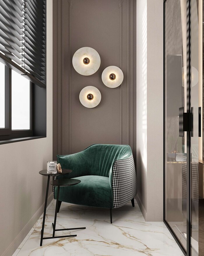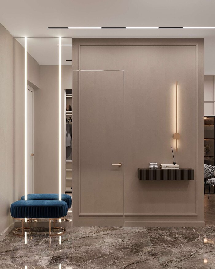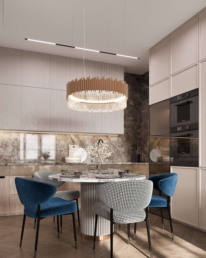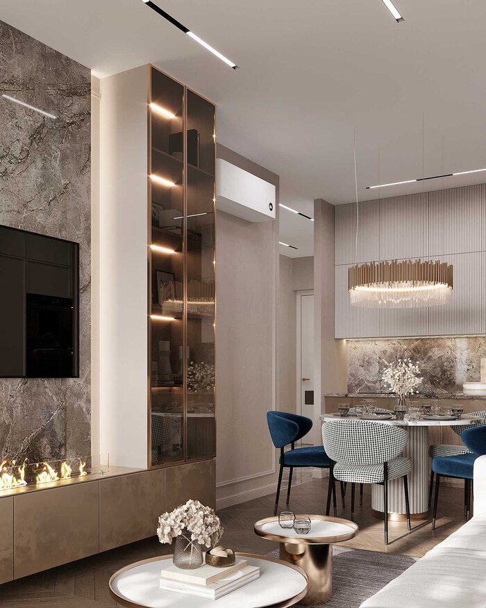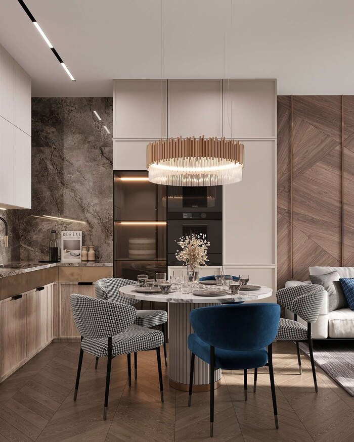 Интерьер выполнен в стиле современная классика с элементами ар-деко, который подчеркивает элегантность и премиальность пространства. Сочетание чистых линий, натуральных материалов и изысканных деталей создаёт гармоничный, сбалансированный дизайн.