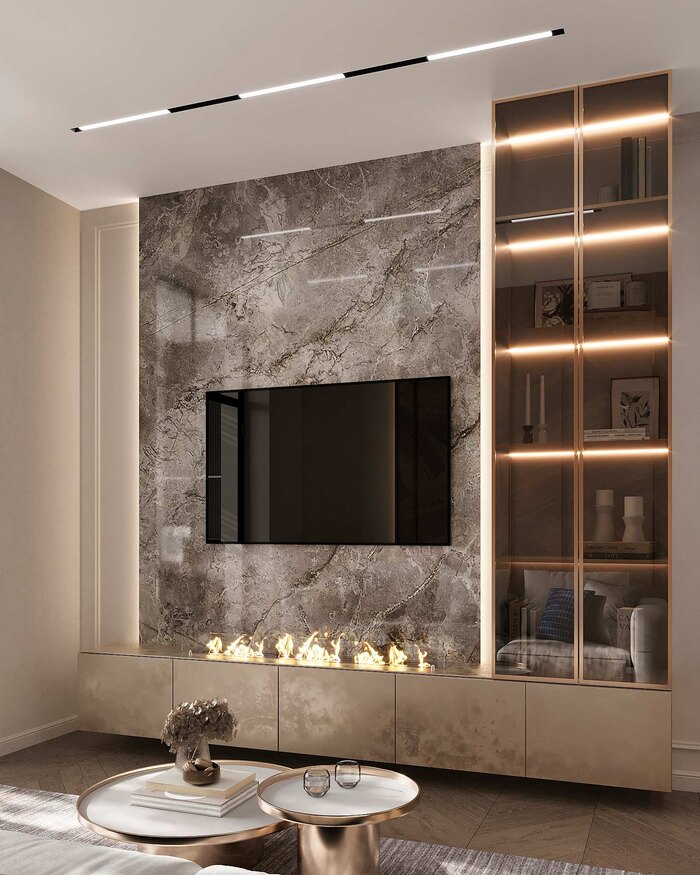 Акцентом гостиной стала ТВ-зона с биокамином. В отделке использован керамогранит с выразительным рисунком, создающий ощущение роскоши и уюта. Живое пламя камина добавляет тепла, а встроенная подсветка в витринном шкафу делает атмосферу еще более уютной в вечернее время.
