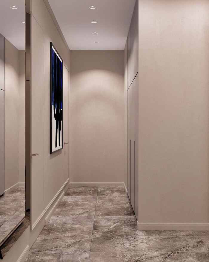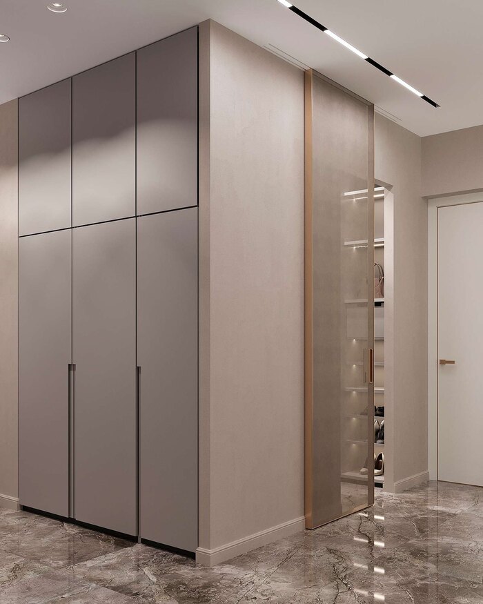 Встроенная система хранения обеспечивает порядок и удобство. Закрытые шкафы позволяют хранить верхнюю одежду, обувь и аксессуары, скрывая их от глаз. Фасады без ручек, выполненные в светлых тонах, создают ощущение цельности и визуальной чистоты.
