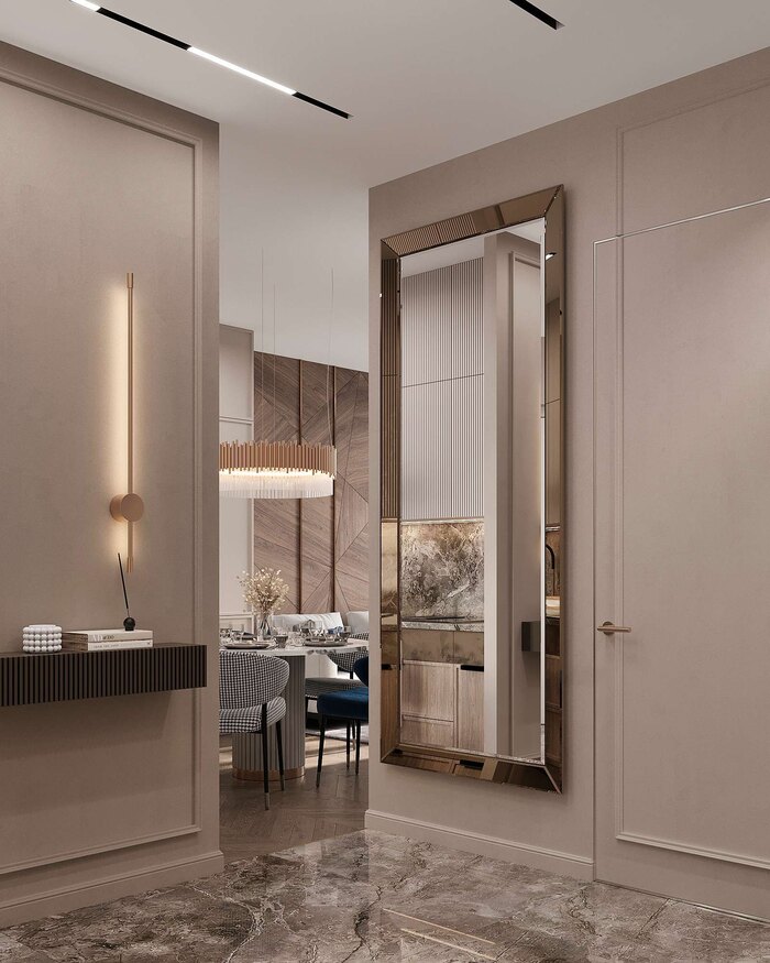 Крупное зеркало в бронзовой раме делает пространство более светлым и просторным. Рядом с зеркалом расположена компактная консоль с настенным светильником, которая делает пространство удобным и эстетичным: Консоль служит удобной поверхностью для ключей, перчаток и аксессуаров. Пол в прихожей выполнен из керамогранита с мраморным узором, что делает его не только стильным, но и практичным в уходе.