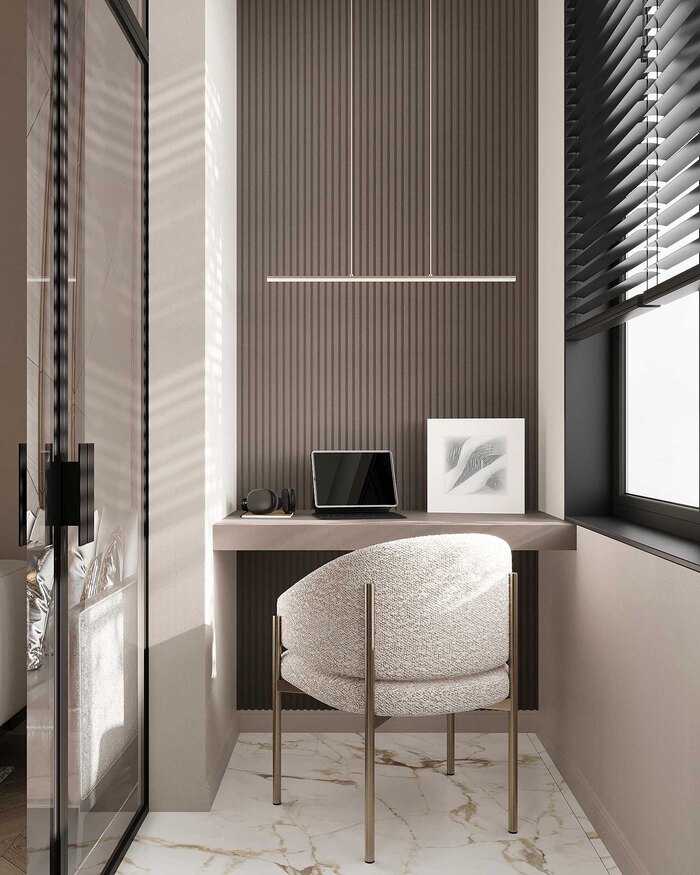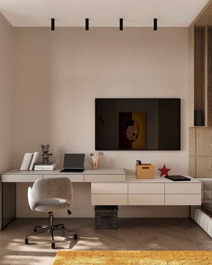 Компактный рабочий стол – выполнен в минималистичном стиле и встроен в нишу, что позволяет рационально использовать пространство.