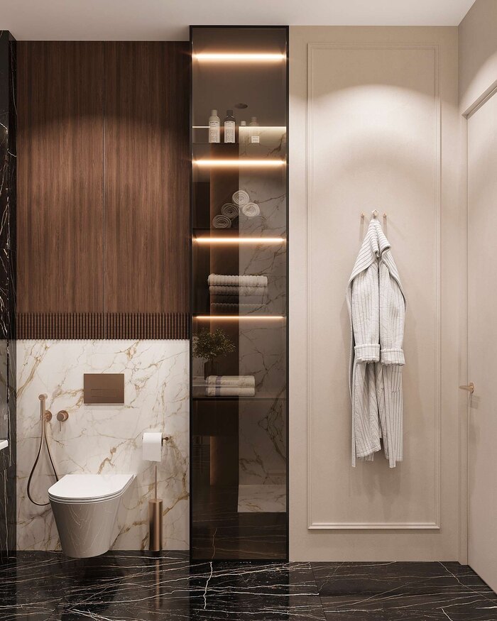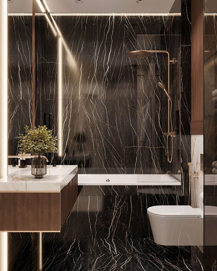 - Крупноформатный керамогранит с текстурой мрамора в отделке стен и пола придаёт интерьеру роскошный вид и обеспечивает долговечность.