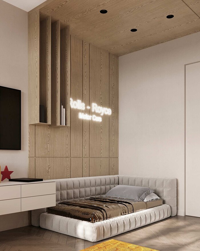 - Натуральный шпон в отделке стен и мебели подчеркивает природную эстетику.