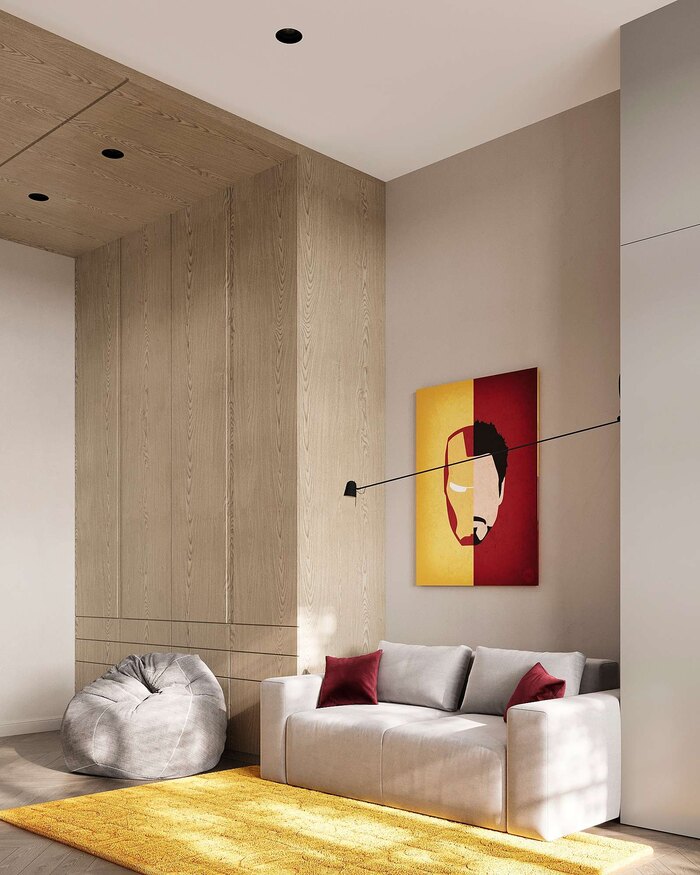 Лаконичная отделка – текстурные панели на стене создают уютную атмосферу, а натуральная палитра способствует концентрации.