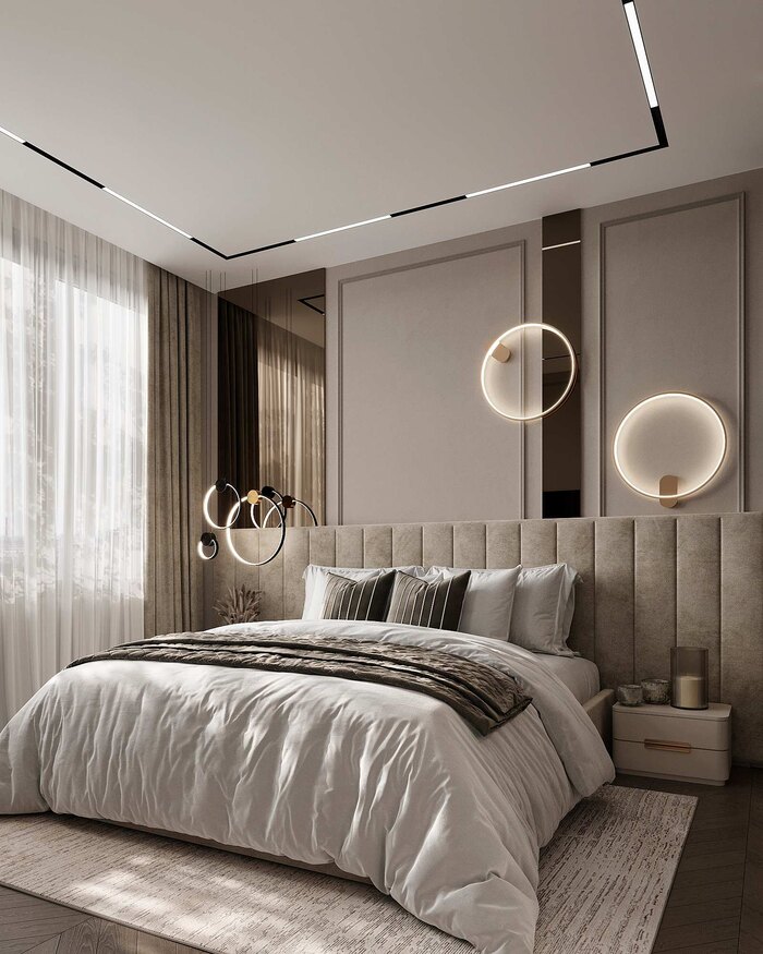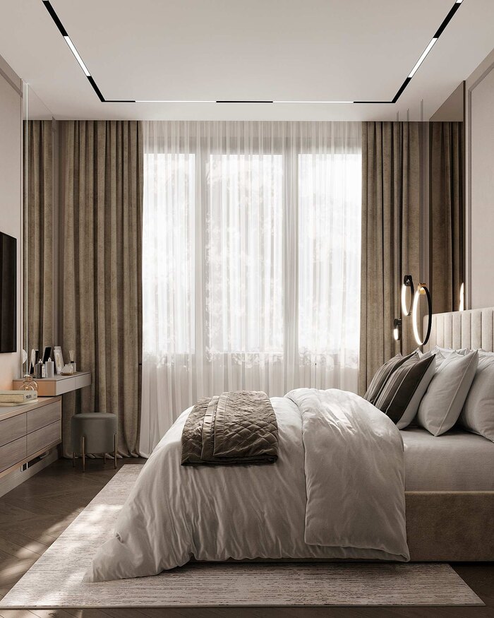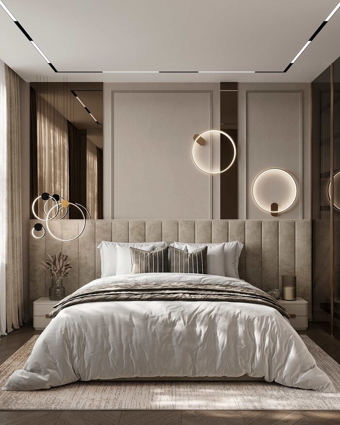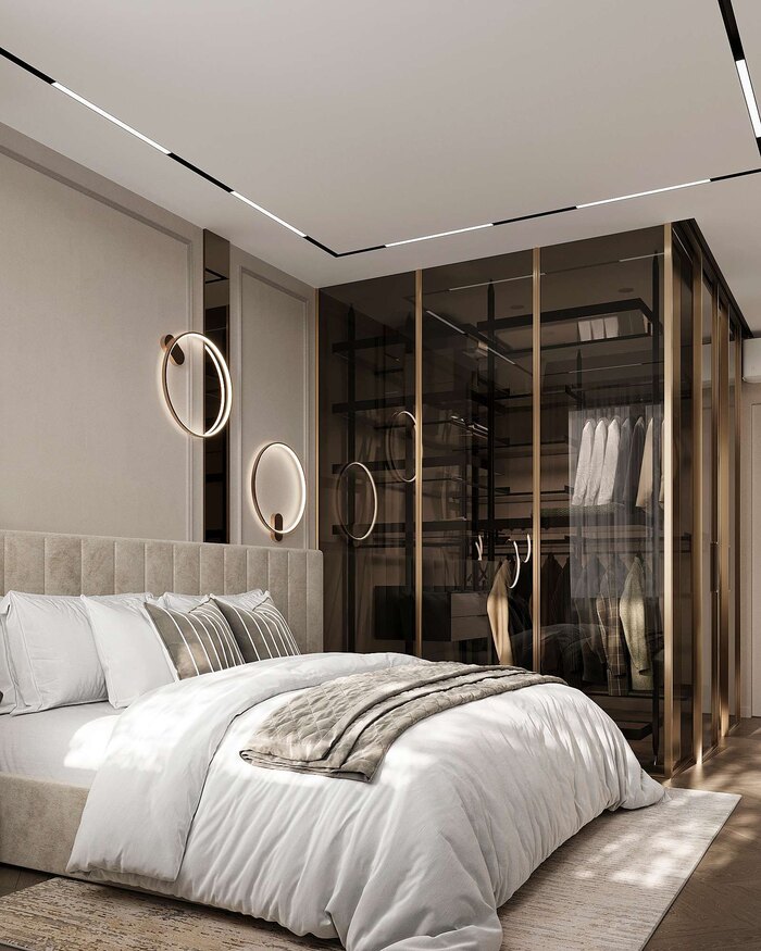 Спальня выполнена в стиле современная классика с элементами ар-деко и отвечает ключевому запросу заказчиков — удобство хранения. В интерьере использованы теплые натуральные оттенки и тактильно приятные материалы..
