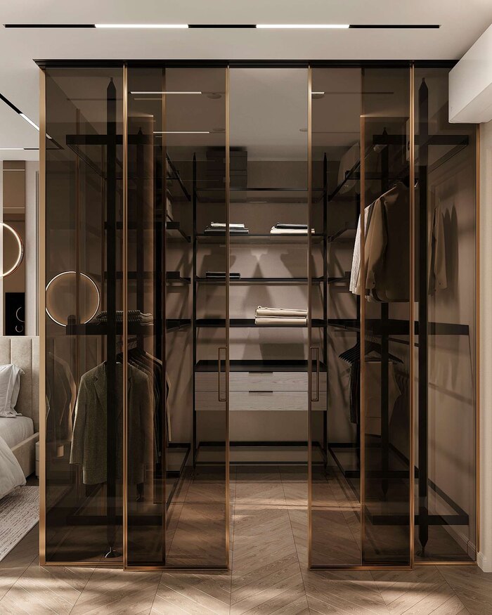 Одним из важных пожеланий заказчиков было организовать удобное и вместительное хранение вещей. Для этого в спальне предусмотрена отдельная гардеробная, которая позволяет рационально использовать пространство и поддерживать порядок.