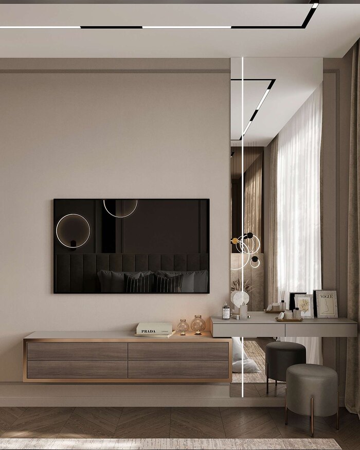 Туалетный столик интегрирован в подвесную ТВ-зону, что делает пространство более универсальным: