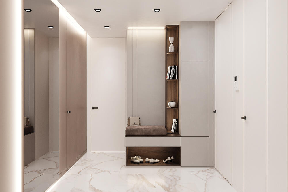 - Зону входной двери визуально объединить по стилю с межкомнатными дверьми