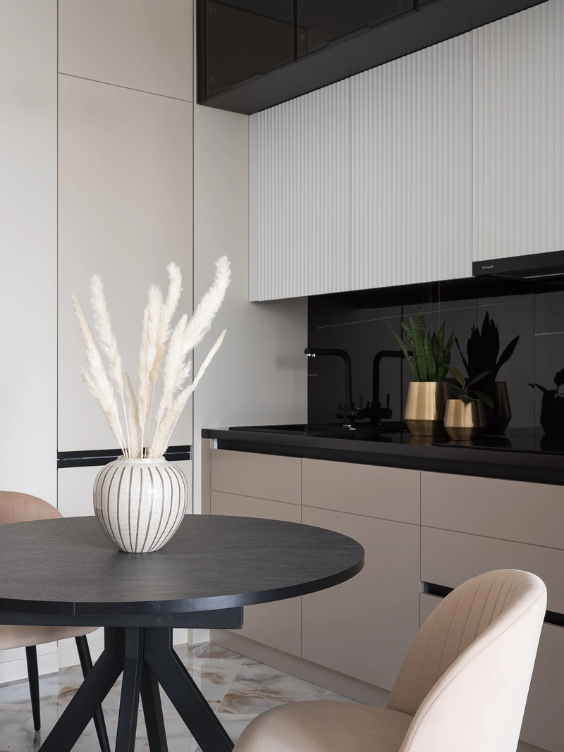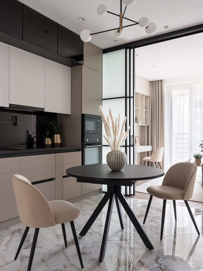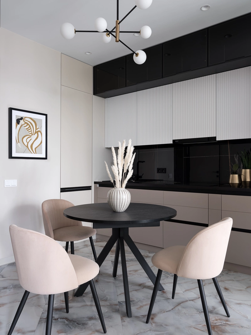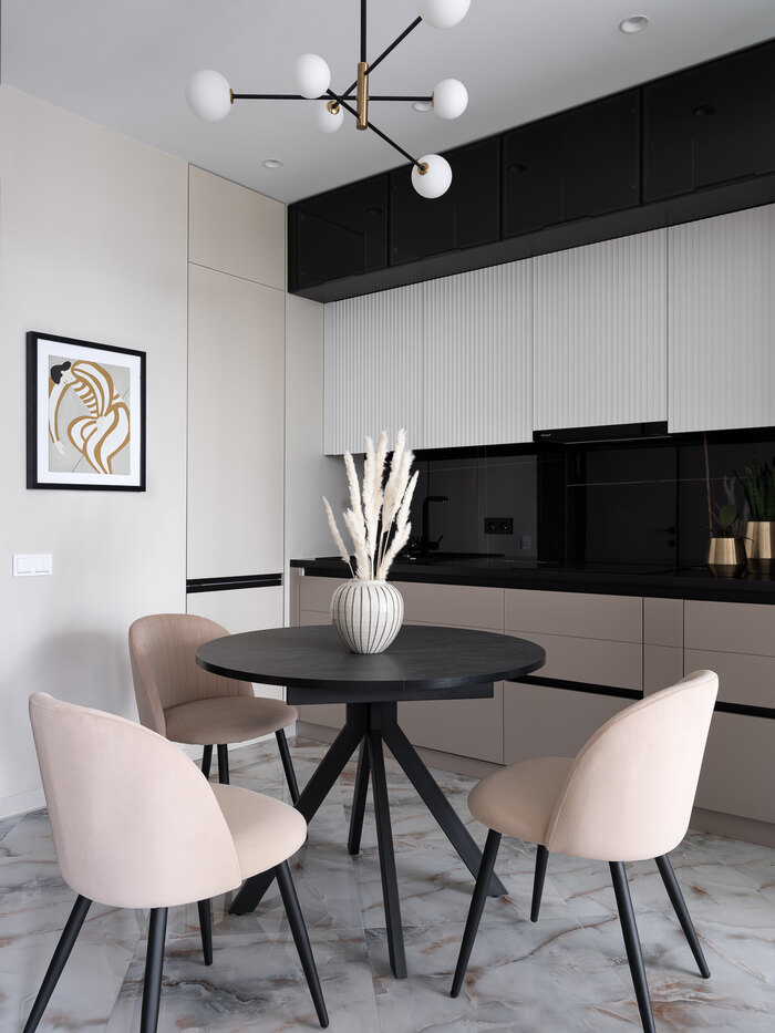 - На кухне использовать уже имеющиеся круглый стол и стулья