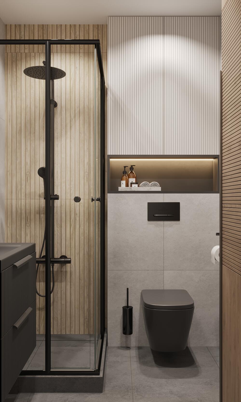 В санузле разместились душевая зона с высоким черным смесителем и стеклянной перегородкой, подвесная тумба с раковиной и шкаф для хранения. Над унитазом сделали аккуратную нишу с подсветкой — в ней удобно держать косметику и полотенца.