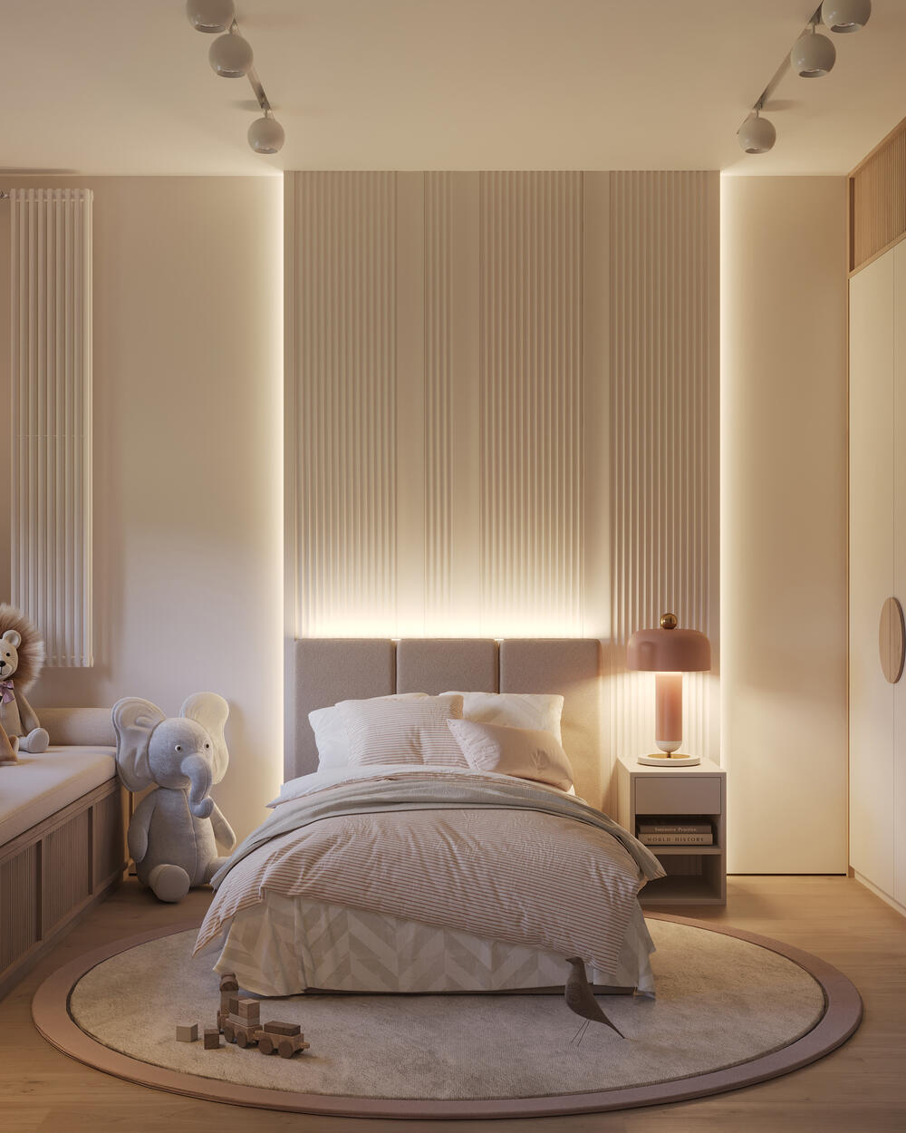 Секрет этой комнаты — игра света: мягкая подсветка панелей и мебели делает пространство по-домашнему тёплым, а вечером создаёт расслабляющую атмосферу.