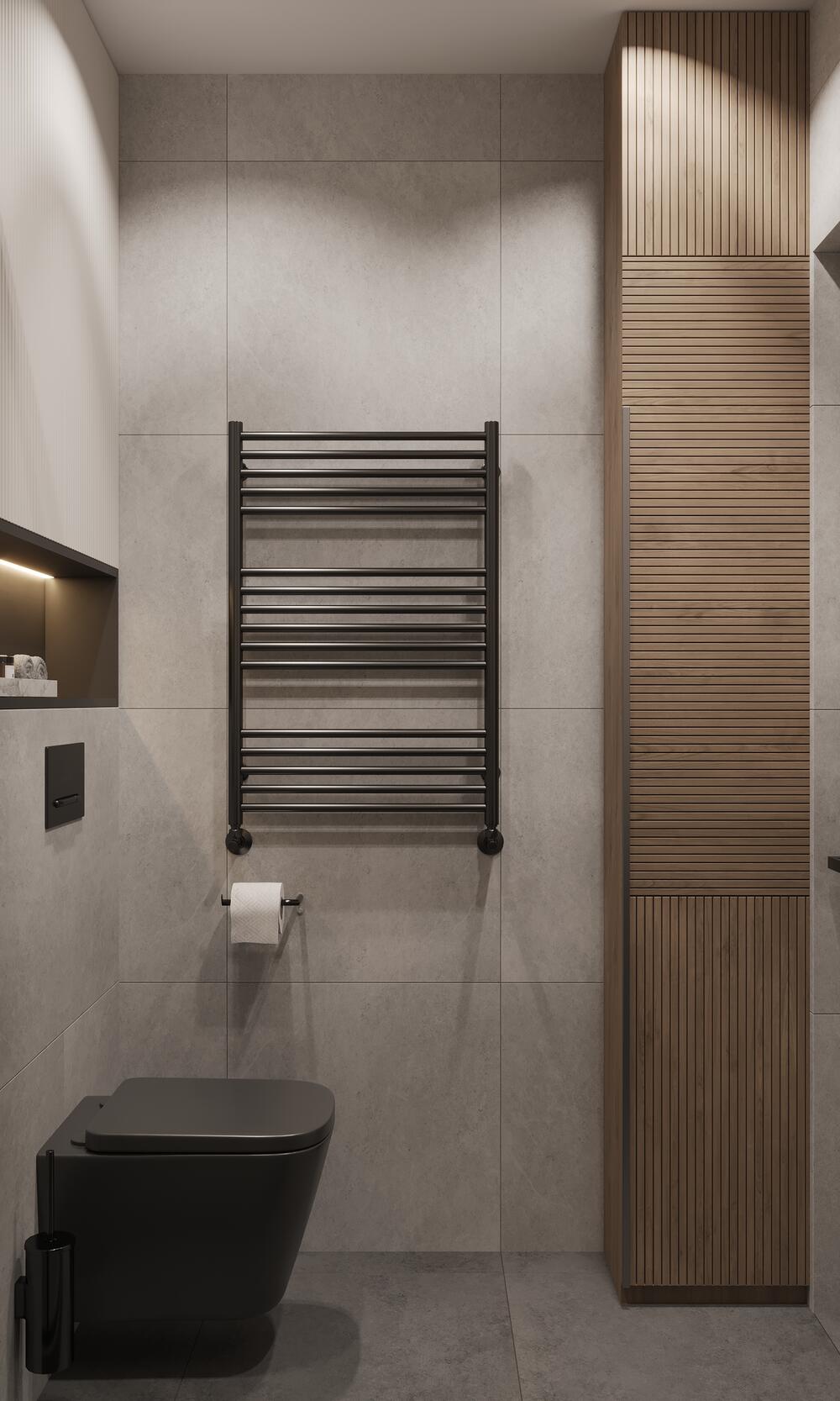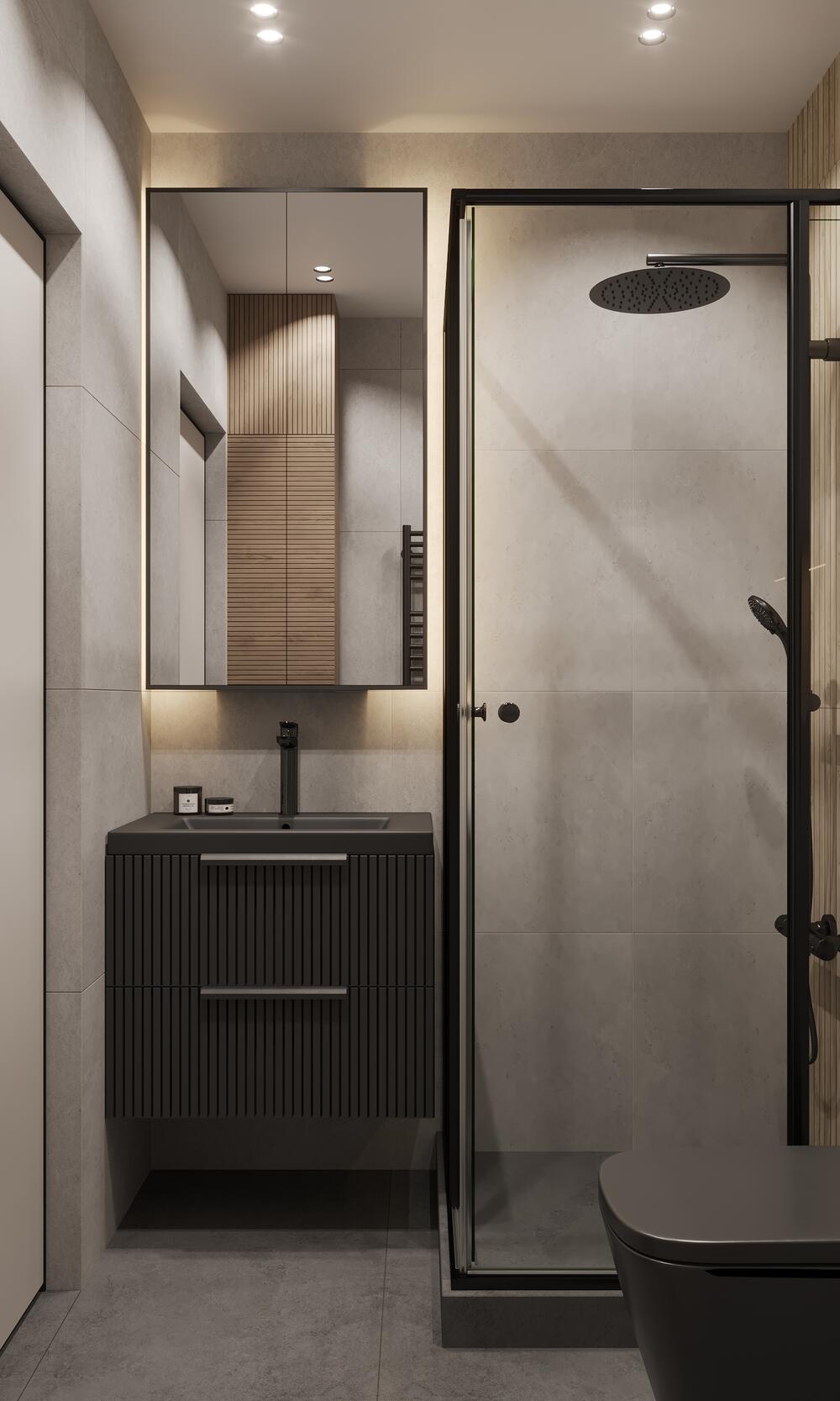 В отделке использованы крупноформатные плиты под бетон и панели под дерево. Такой контраст смотрится современно, а черная сантехника и фурнитура добавляют графичности.
