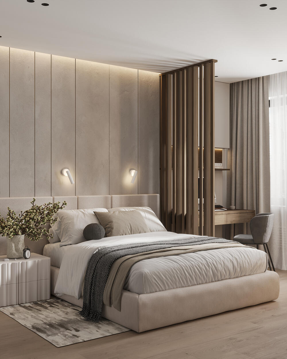 Отдельный плюс — рабочая зона прямо в спальне. Лёгкая реечная перегородка отделяет её от кровати, создавая уединённый уголок для компьютера или чтения документов. Такой приём экономит место и при этом не перегружает интерьер.