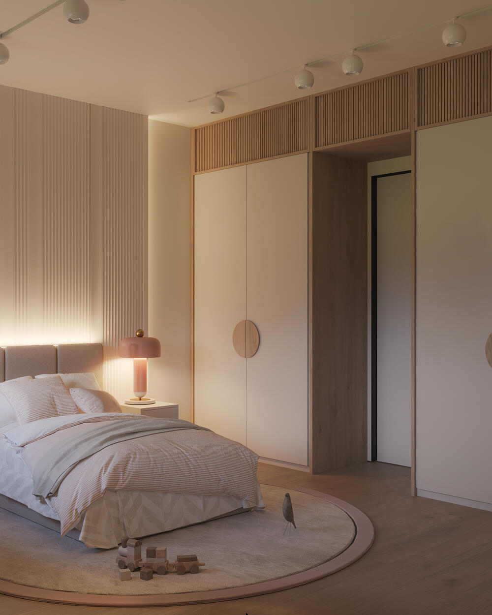 Акцентные детали — пудровые оттенки, теплый свет и фактура дерева. Они создают атмосферу спокойствия, а за счёт встроенной мебели и светлых стен пространство кажется просторнее.