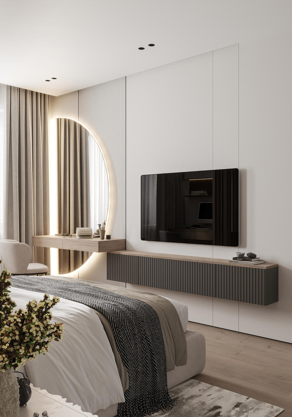 У окна сделали туалетный столик с большим подсвеченным зеркалом — им удобно пользоваться и утром, и вечером. Рядом разместили вместительный шкаф: фасады без ручек сливаются со стеной, и за счёт этого комната выглядит просторнее.