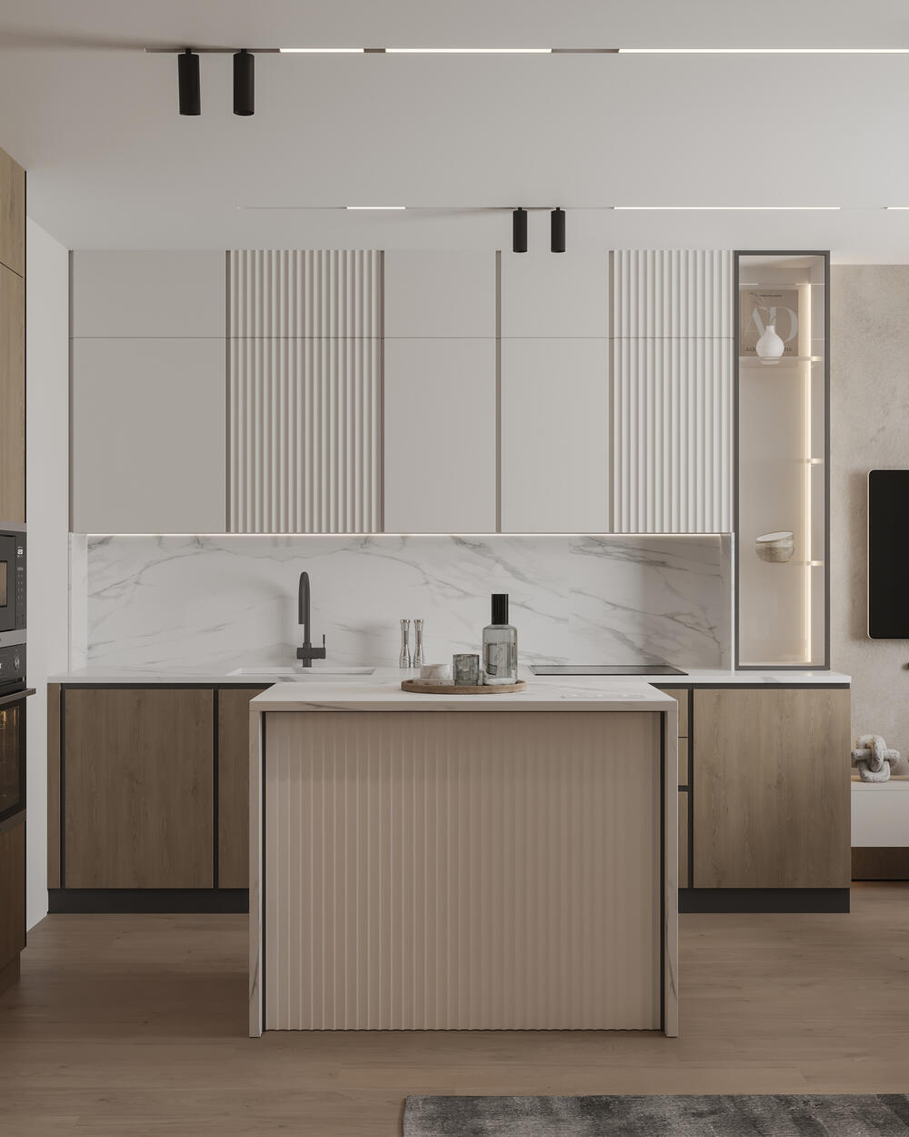 Атмосферу задает мягкое сочетание природных материалов и встроенная подсветка. Здесь удобно готовить, собираться всей семьей и проводить время вместе — пространство получилось современным и живым.