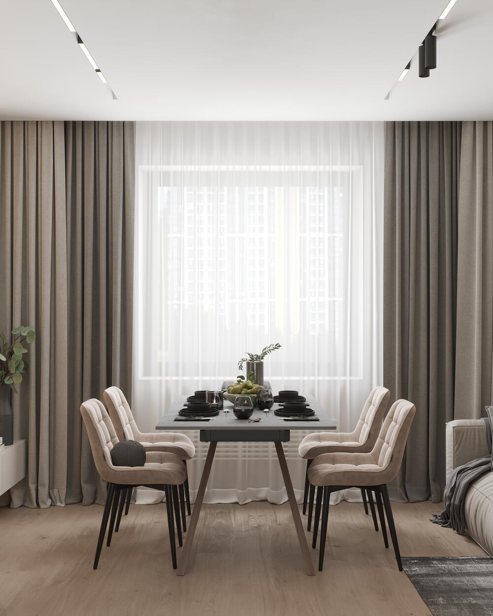 Текстиль в спокойных оттенках — шторы, мягкая мебель и декоративные элементы поддерживают атмосферу уюта и лёгкости.