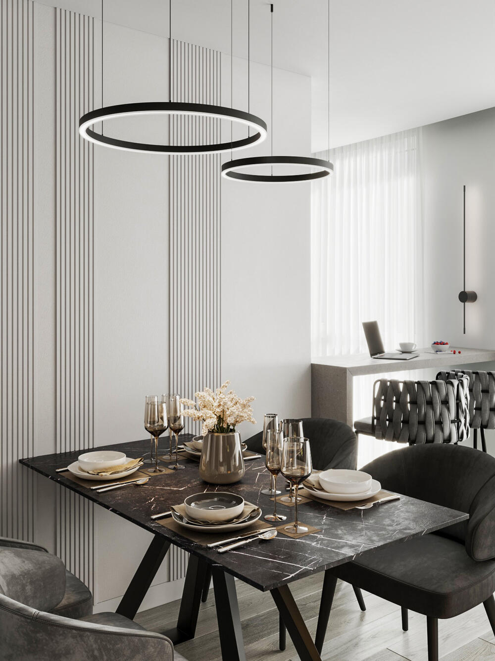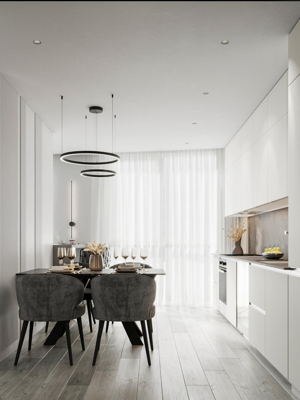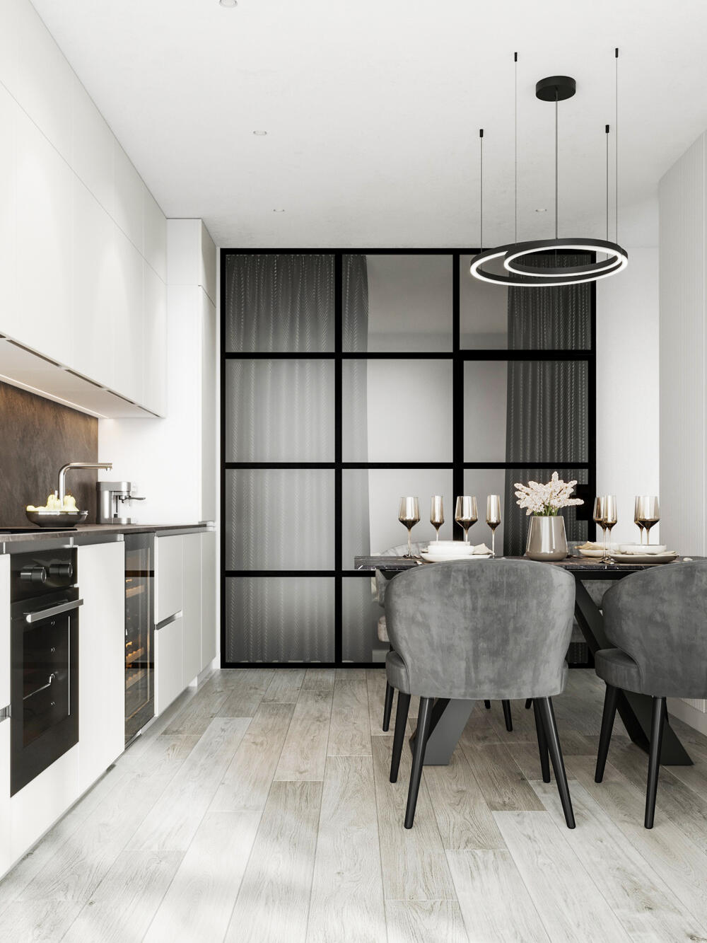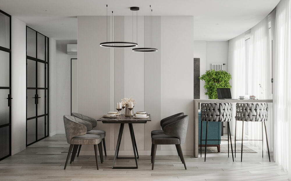 - Сохранить «воздушность, легкость» помещения, но иметь возможность зонировать часть прихожей для принятия курьеров