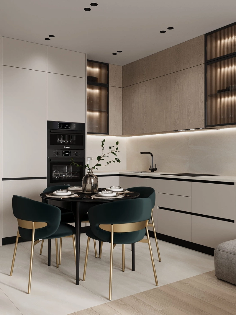 Кухня оформлена в современном стиле с угловой планировкой, которая обеспечивает эргономичное использование пространства.