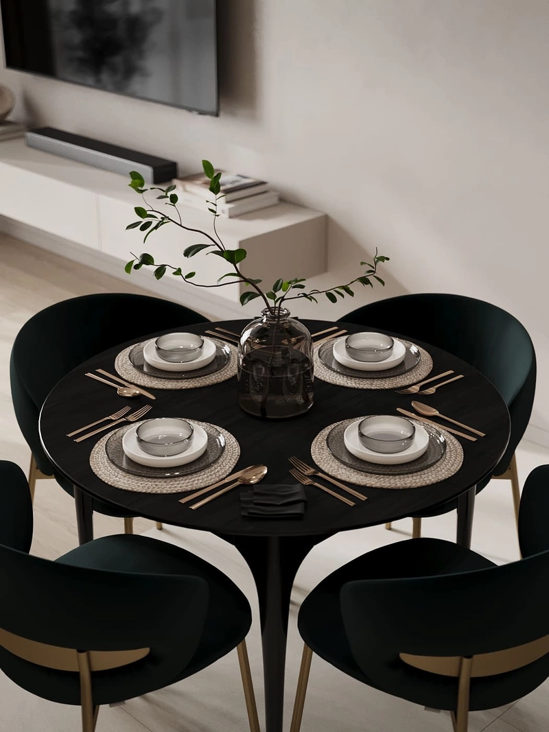 Центральный элемент кухни — раскладной обеденный стол. В сложенном виде компактный, в разложенном удобен для приёма гостей.