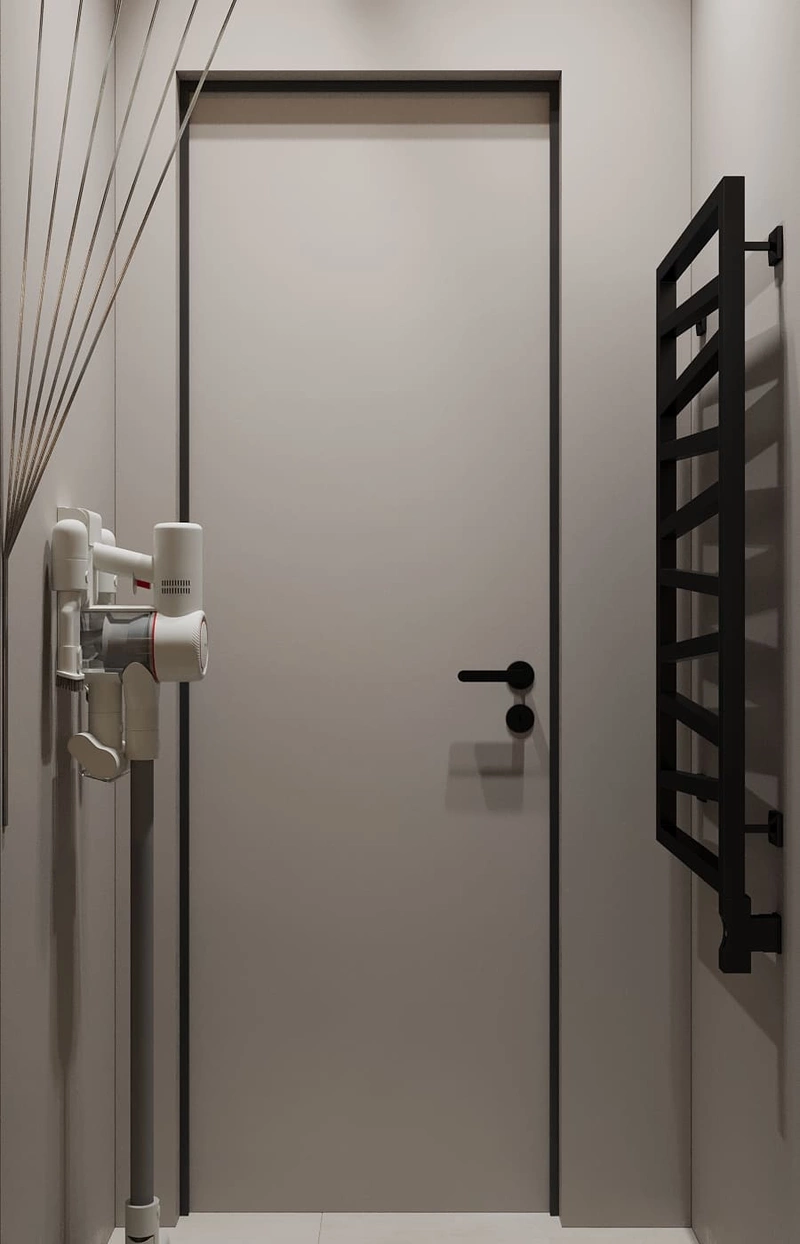 Один из санузлов был переоборудован в постирочную. В результате получилось компактное, но максимально функциональное помещение, где предусмотрены зоны для стирки, сушки и хранения бытовой химии и текстиля. Вертикальное размещение стиральной и сушильной машины — позволяет эффективно использовать площадь и освободить место для хранения. Открытые полки с подсветкой — удобное решение для хранения бытовой химии, полотенец и хозяйственных принадлежностей. Настенное крепление для пылесоса — помогает оптимально организовать пространство и держать технику под рукой.