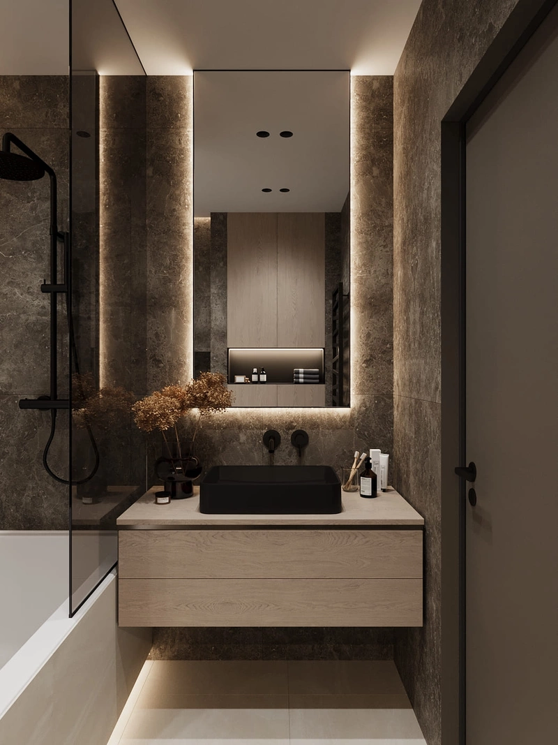 Подсветка под тумбой и на стене за зеркалом создаёт уютную атмосферу и подчёркивает премиальность интерьера.