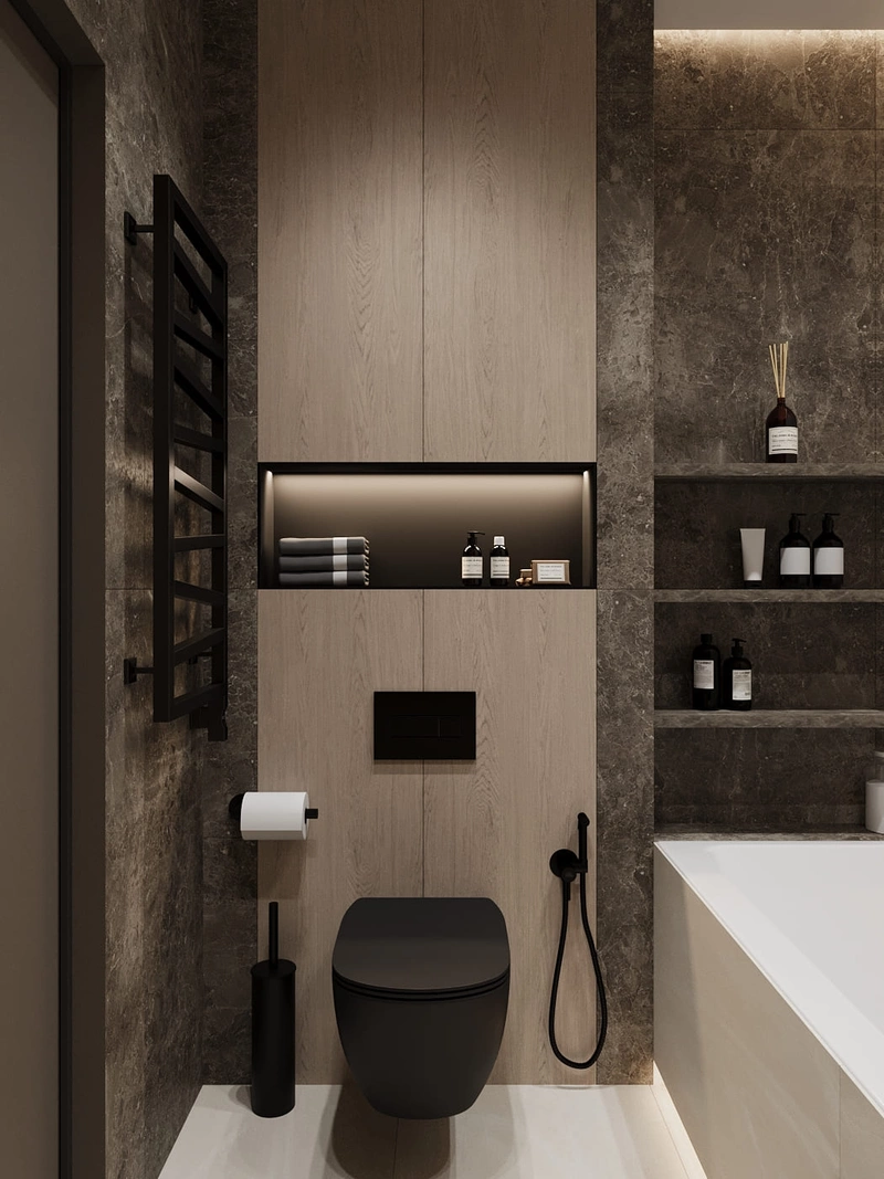 Одним из ключевых пожеланий заказчиков было создание функциональной и стильной ванной комнаты, где удалось разместить большую встроенную ванну 190×80 см и учесть удобство хранения. Встроенная ванна установлена таким образом, чтобы максимально использовать пространство. Открытые полки из керамогранита в зоне ванны позволяют хранить косметику и аксессуары, сохраняя эстетику. Подвесная тумба с раковиной обеспечивает удобное хранение и лёгкость в уходе.