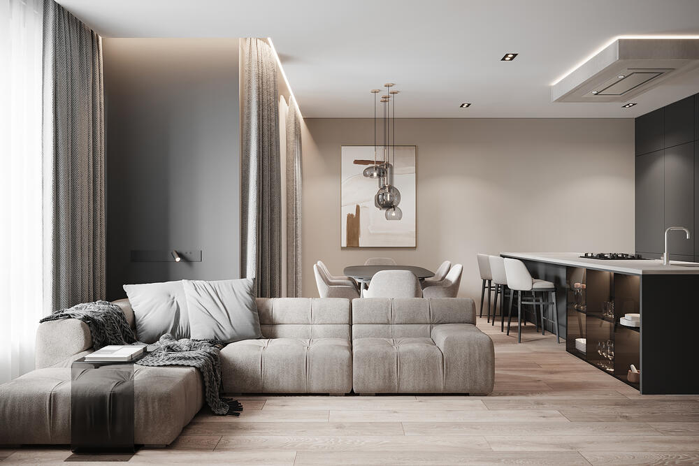 - Удобная минималистичная кухня, мягкий диван, уютная гостиная, задача сделать минимализм мягким и уютным