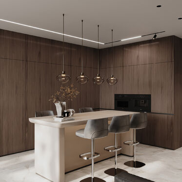 Для создания натуральной теплоты в интерьере были использованы панели из шпона. Они добавляют текстуру и естественную красоту, гармонично вписываясь в каждое помещение.