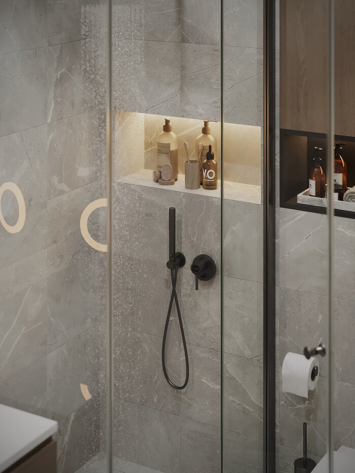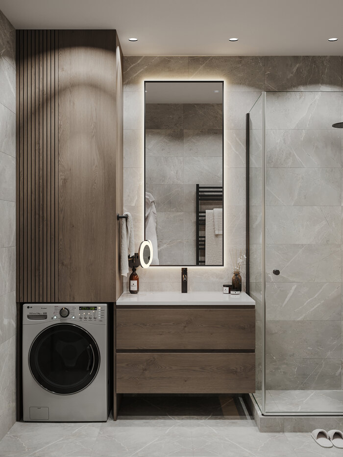 Расширена за счёт перепланировки. Теперь в ней комфортно разместились душевая зона и стиральная машина. В отделке использован керамогранит с текстурой натурального камня — практично и эстетично.