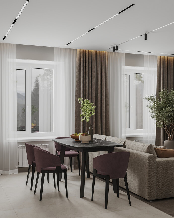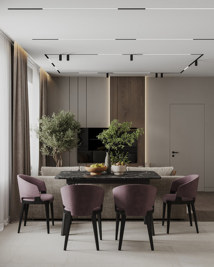 Используемые материалы — от обоев под покраску до инженерной доски и керамогранита — подчеркивают современность и натуральную красоту, при этом поддерживая общую гармонию и уют. Панели из шпона с подсветкой добавляют глубину и текстуру, а акценты, такие как фиолетовые стулья в кухне-гостиной, делают пространство выразительным и индивидуальным.