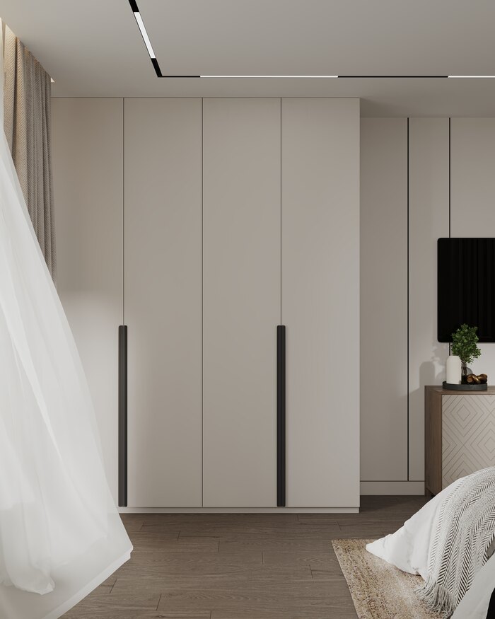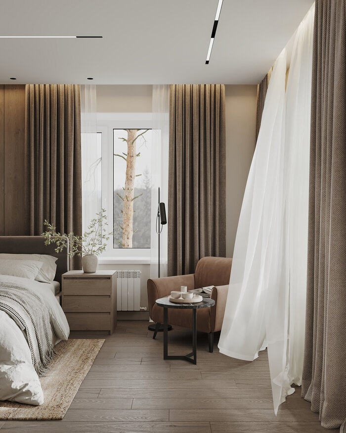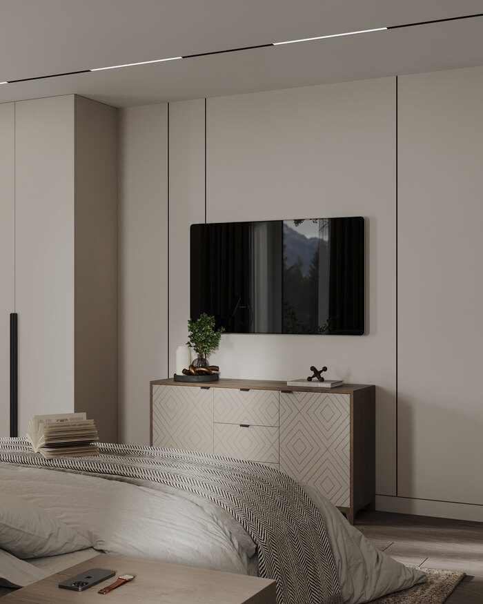 Спокойная, светлая и интимная зона. Стена за изголовьем оформлена панелями из натурального шпона с подсветкой — создаёт эффект глубины и защищённости. Интерьер поддержан мягкими текстурами и приглушённой палитрой. Вход организован со стороны гостиной, что позволило выделить место для гардеробной.