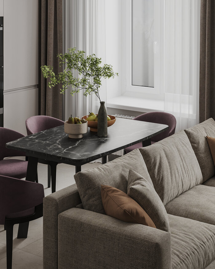 Акцент на фиолетовые обеденные стулья. В кухне-гостиной обеденные стулья фиолетового цвета становятся ярким акцентом, который органично вписывается в общую цветовую гамму интерьера, добавляя индивидуальности и стильности.