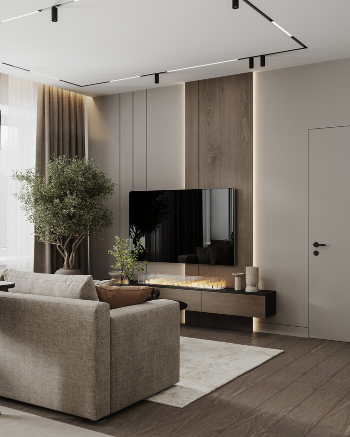 В отделке использованы светлые и сложные оттенки: сливочный, капучино, бежевый. Панели из шпона с подсветкой добавляют глубины и фактурности. Мебель и текстиль подобраны в приглушённой гамме — интерьер выглядит сдержанно и собранно.