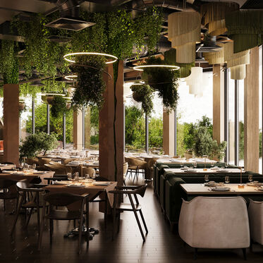 Посмотреть проектДизайн интерьера ресторана европейской кухни "Пейзаж" в экостиле - 226 м2