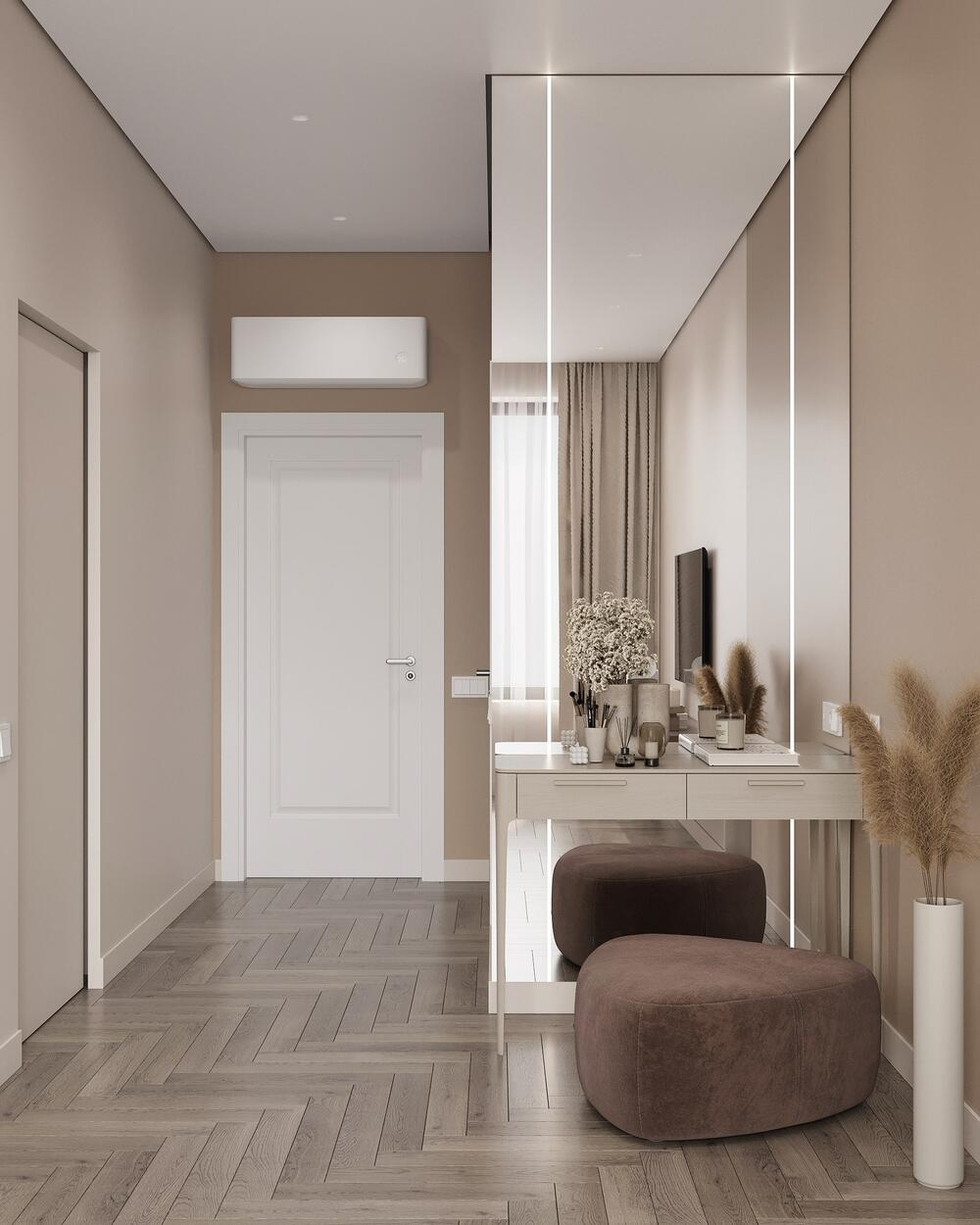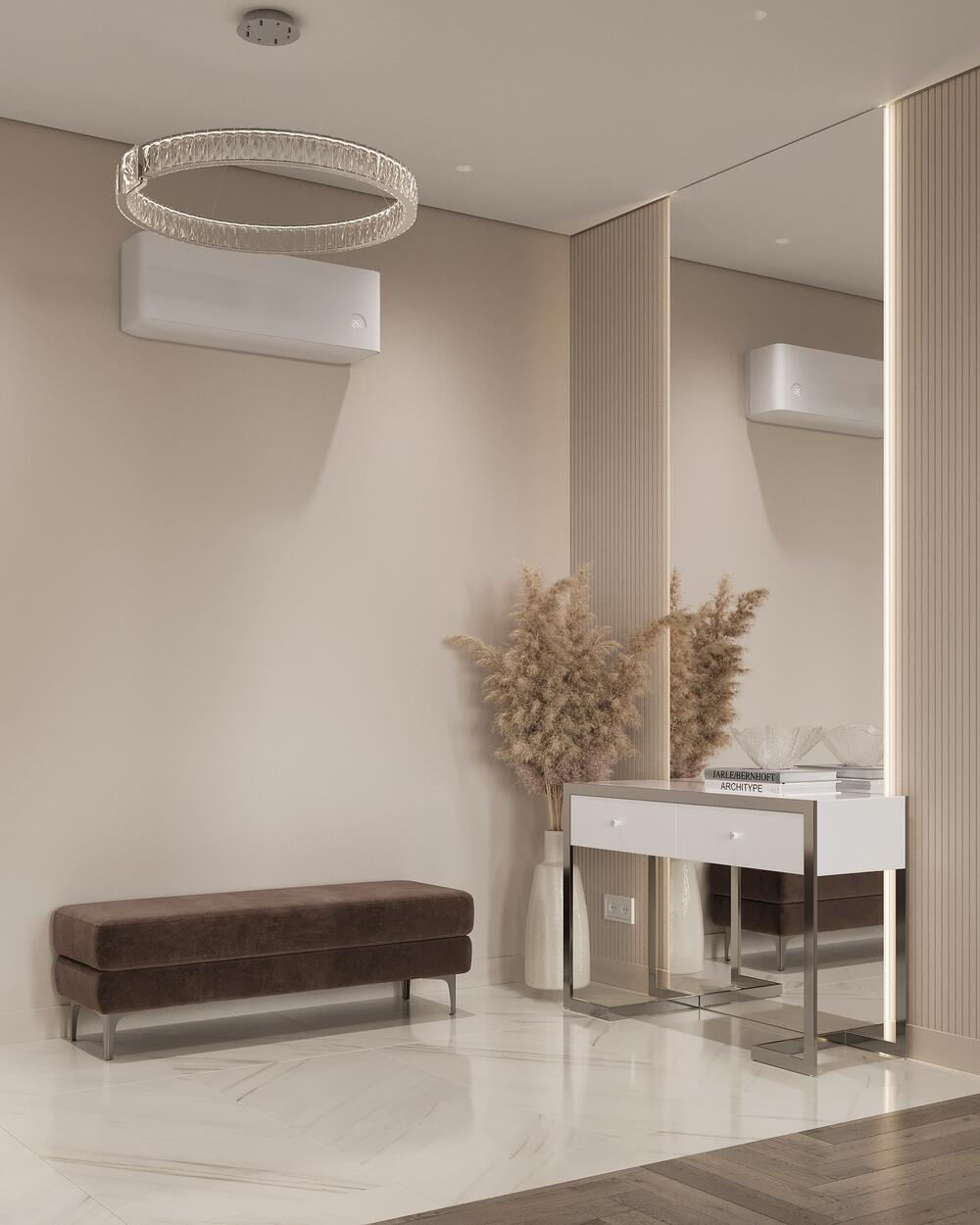 Главный акцент — большое зеркало с подсветкой и консольный стол. Это не только красиво, но и удобно: можно оставить ключи, проверить образ перед выходом. Рядом — мягкая банкетка, чтобы удобно обуваться.
