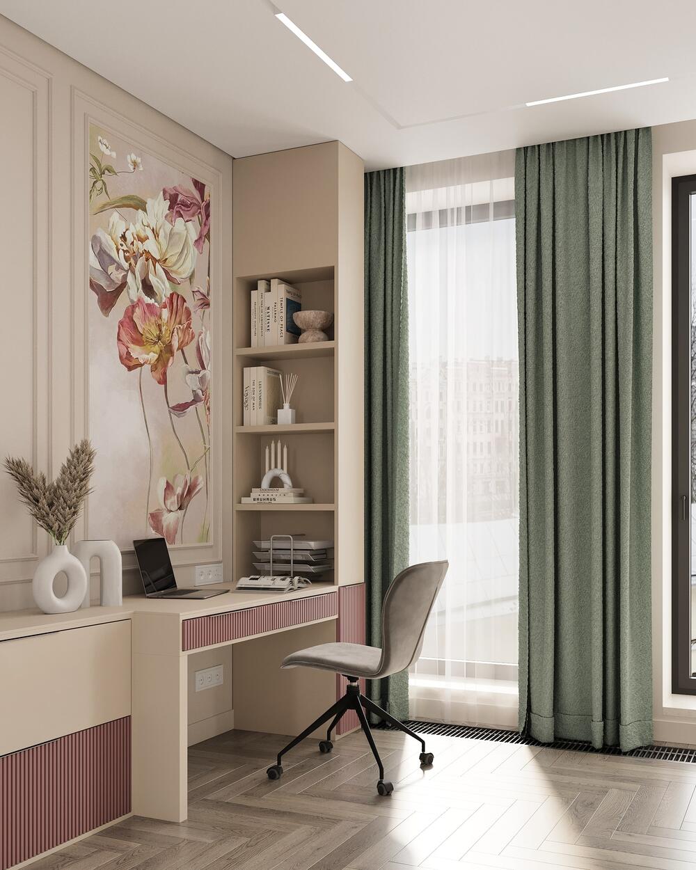 Комнату для девочики мы спроектировали с учётом главного пожелания заказчицы — сделать интерьер «на вырост». Хотелось избежать типично детских решений и создать пространство, которое будет актуально и через несколько лет.